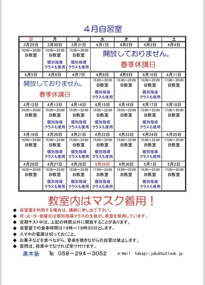 自習室開放時間は下記を参照してください。教室や玄関にも掲示してあります。
